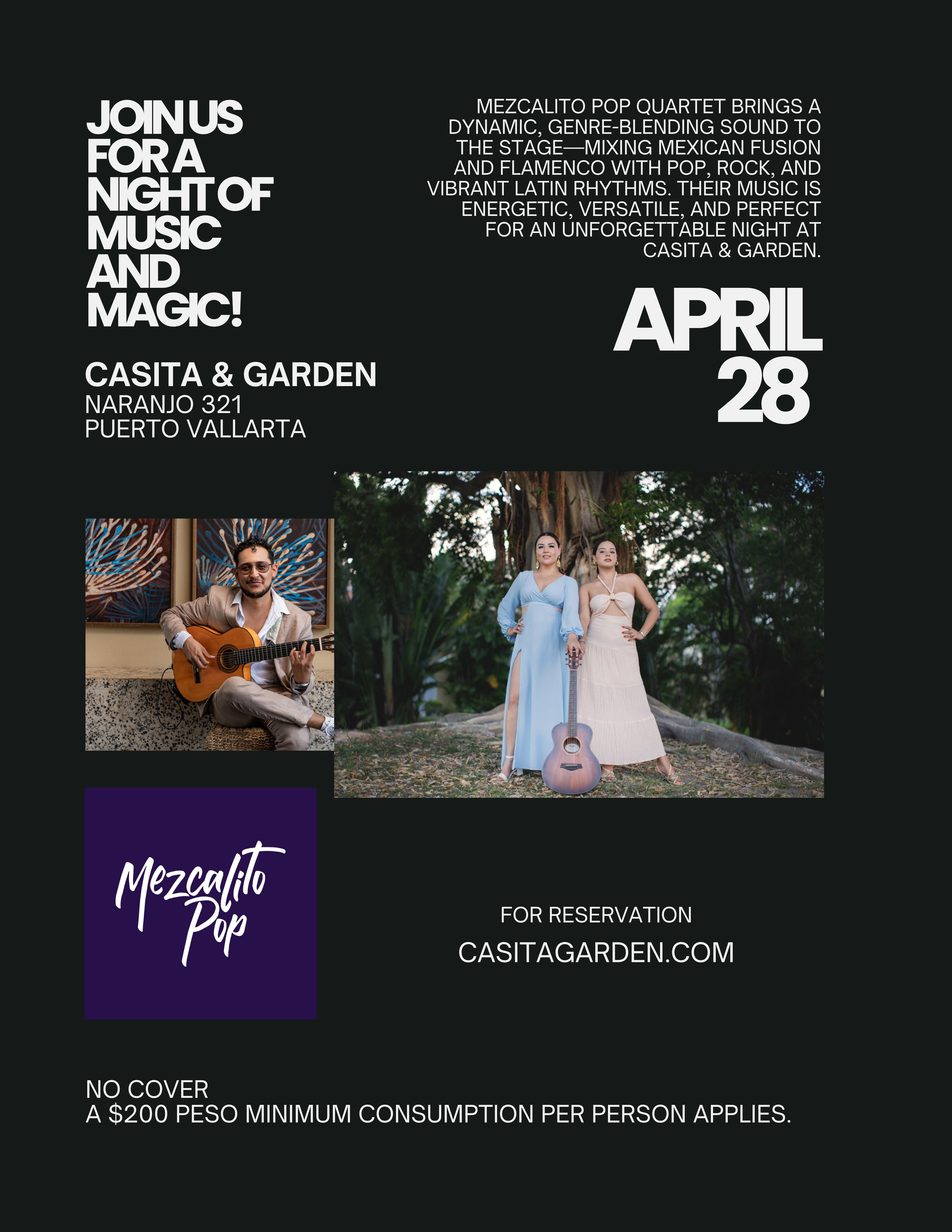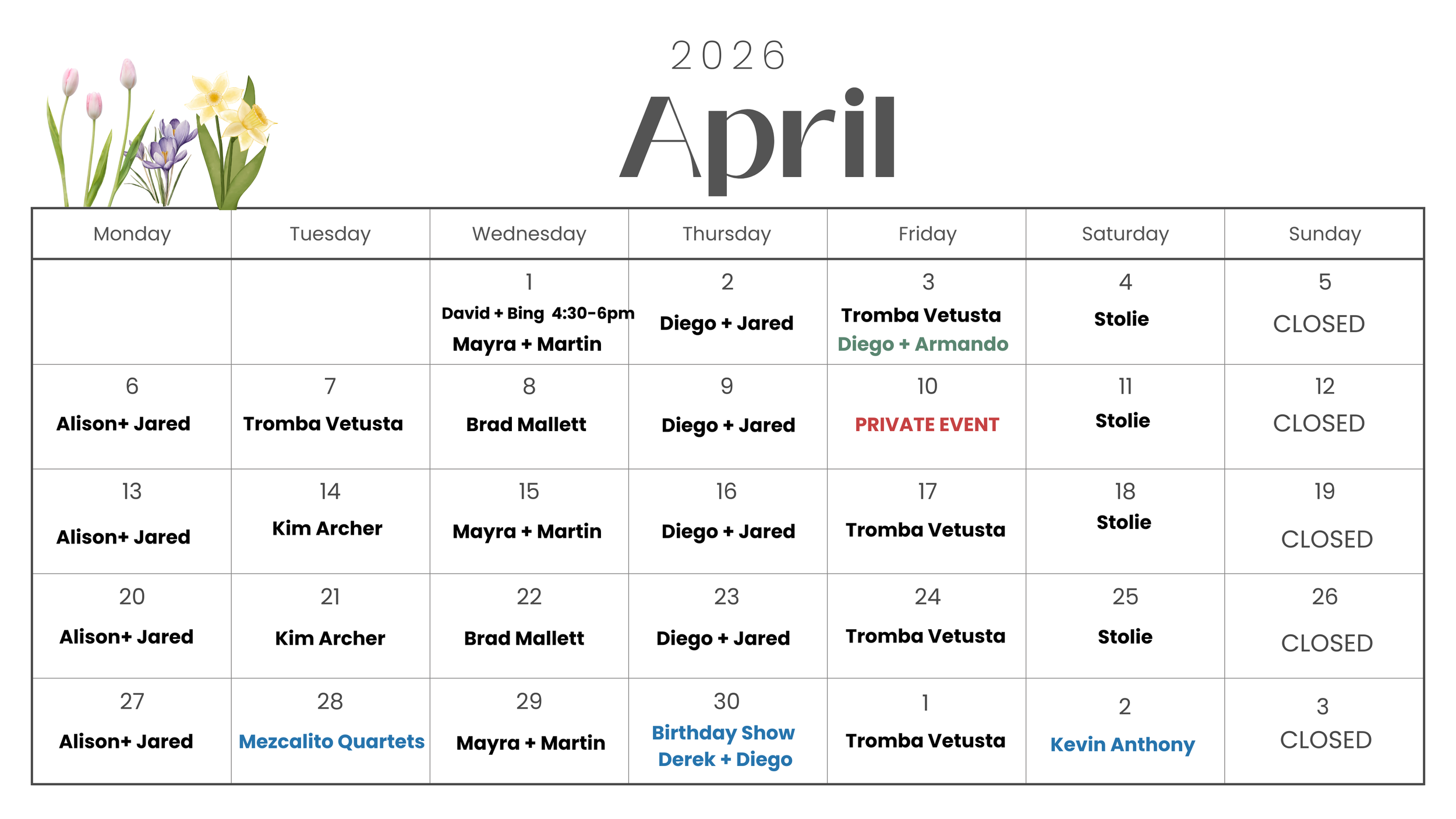 April is shaping up to be a magical month, with special events celebrating Derek & Diegoβs birthdays, along with incredible music by Mezcalito Quartets β see them here https://youtu.be/ir3RLysc-xM